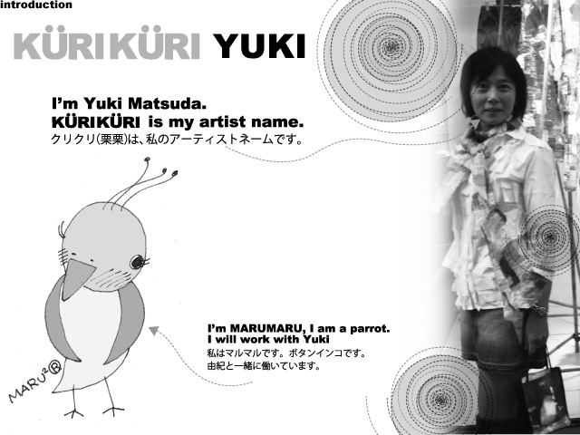| Mi chiamo Yuki Matsuda e sono una disegnatrice grafica Giapponese originaria di Tokyo. Il mio nome d'arte e' KURIKURI. Oltre al campo della grafica mi specializzo nella creazione di siti web, composizioni floreali, impianti su misura creati per esposizioni, ed impianti spaziali. Mi specializzo nell'uso di molti colori e diverse tecniche come ad esempio il collage ed il ricamo. Potrete ammirare una parte delle mie creazioni nella sezione arte ed altro nel sito web KURIKURI. Credo profondamente nell''influenza della giusta combinazione di colori sull'umore dello spettatore. Secondo me il colore ha un potere magico e rallegrante sulle persone. Oltre alle qualifiche elencate in precedenza possiedo una licenza per creare spettacoli di fuochi d'artificio in Giappone. Un giorno vorrei applicare le mie conoscenze nel campo dei fuochi d'artificio per un pubblico italiano. |